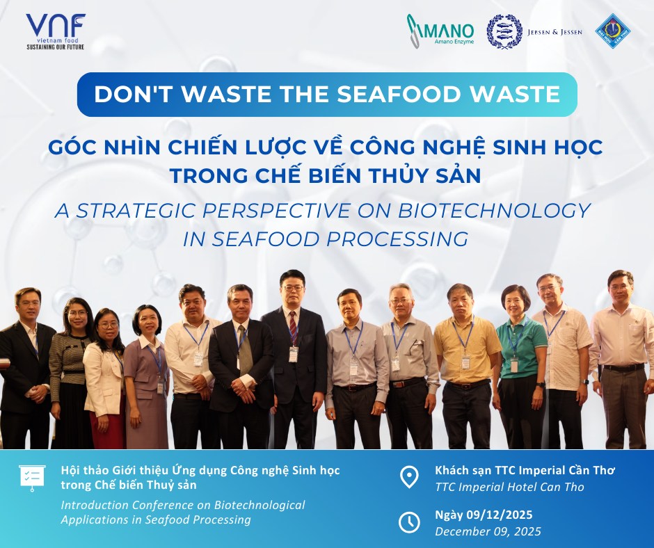 📅 On December 9, 2025, at the Biotechnology Application Introduction Workshop organized by Amano Enzyme Vietnam, Jebsen & Jessen Ingredients, and Can Tho University (Đại học Cần Thơ – CTU), Mr. Phan Thanh Loc, Chairman of VNF, participated as a guest speaker and shared the topic “Biotechnology Applications in Seafood Processing – From By-products to High-Value Products.”